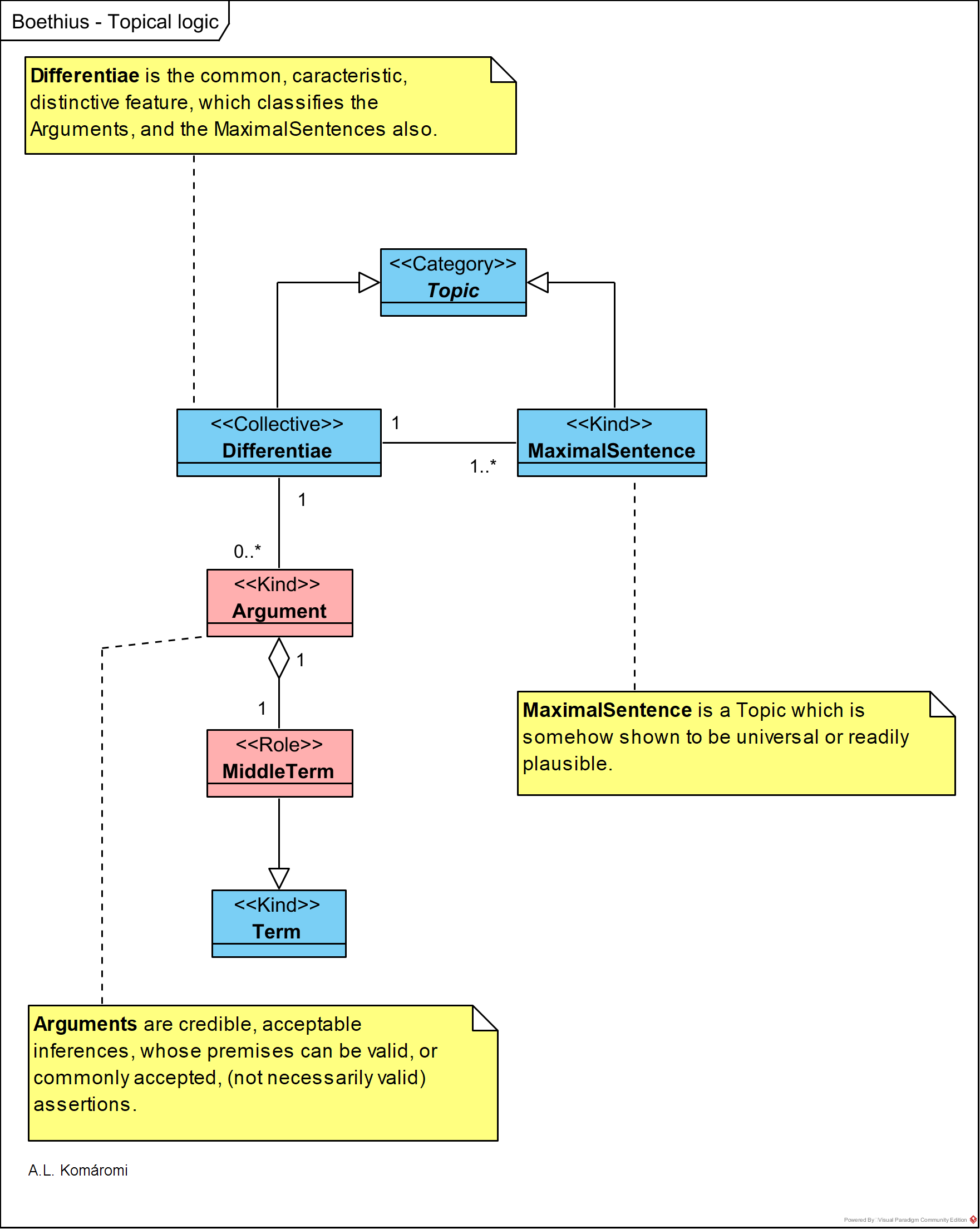 | Differentiae | Topical Differentiae are the common, caracteristic, distinctive feature, which classifies the Arguments, and the MaximalSentences also. Boethius lists over 30 Differentiae, like: – “from the lesser” – “from an efficient cause” – “definition” | A Differentiae is assotiated with at least one MaximalSentence; and with 0, 1 or many Arguments |