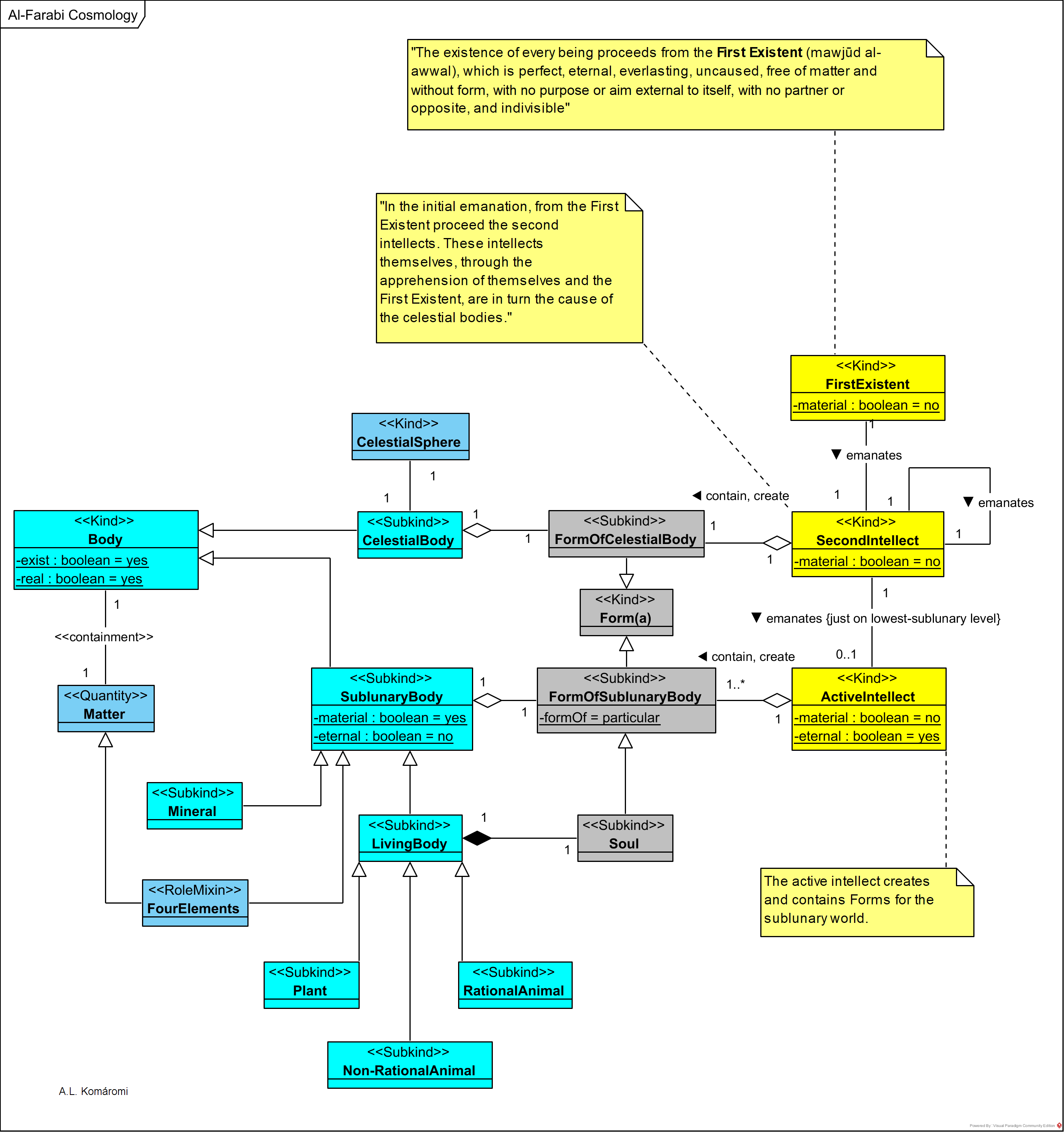 | SecondIntellect | Each Second Intellect creates and contains a Form for a CelestialBody (e.g. the form of Saturn), and emanates a next level of Intellect. “Every existent comes to be, according to al-Fārābī, by the First Existent. This takes place through a sort of expansion or emanation through which the First Existent necessarily gives existence to every being in the universe. Yet this does not imply any addition to its own perfection. In the initial emanation, from the First Existent proceed the second intellects. These intellects themselves, through the apprehension of themselves and the First Existent, are in turn the cause of the celestial bodies.” | contains FormOfCelestialBody; emanates next level of SecondIntellect |