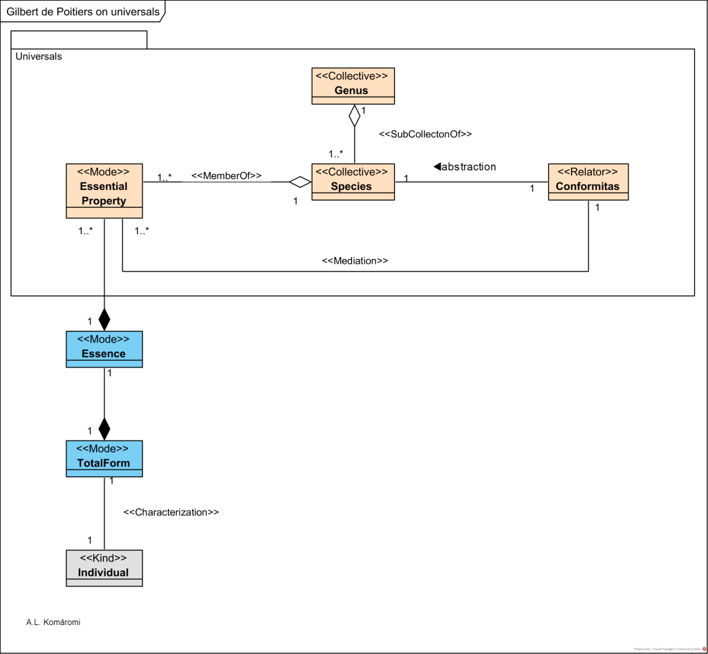 Gilbert’s model of universals is pictured in the following OntoUML diagram: