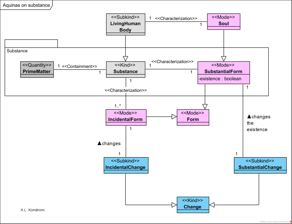 The following OntoUML diagram presents Aquinas’s model of substance and change: