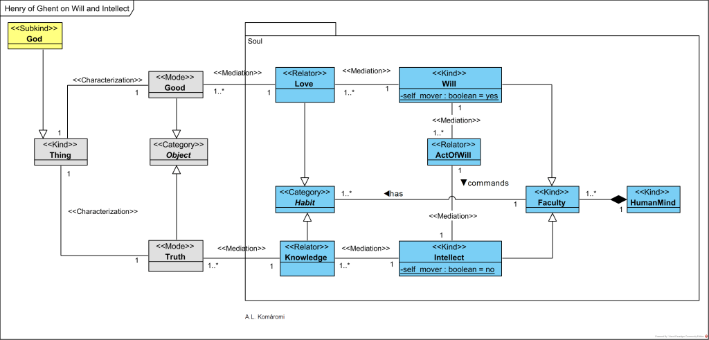 The following OntoUML diagram presents Henry of Ghent’s model of will and intellect: