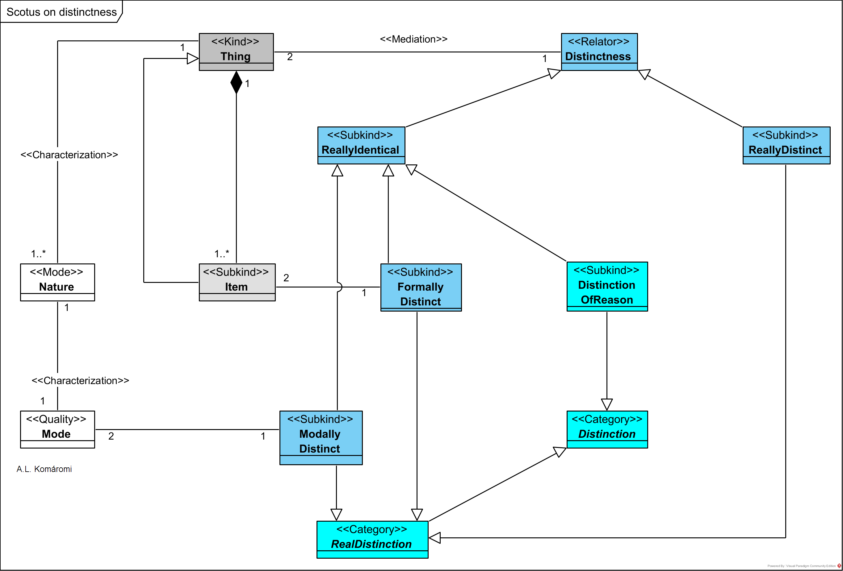 The following OntoUML diagram presents Duns Scotus’s analysis of identity and distinctness: