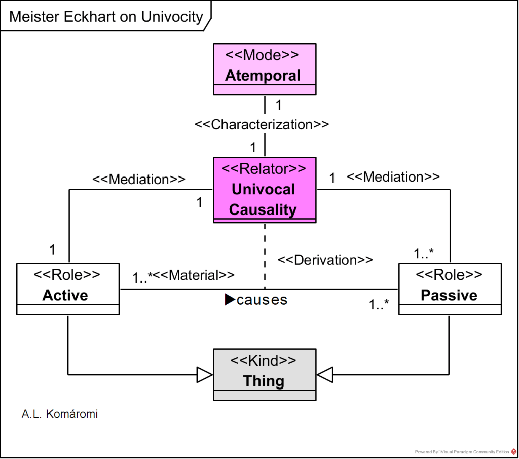 The following OntoUML diagram shows Eckhart’s model of univocal causality: