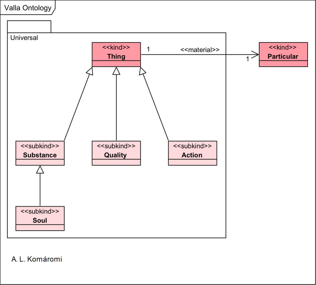 | Quality | “Hence, there are three basic categories: substance, quality, and action. […]” | subkind of Thing |