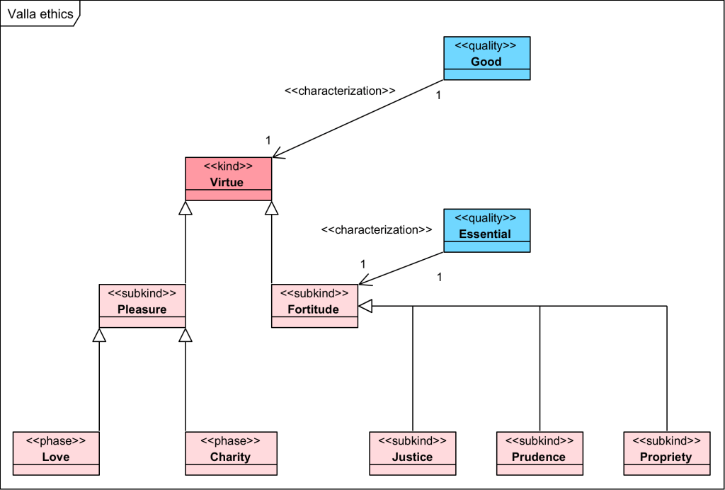 | Essential | “For Valla, fortitude is the essential virtue, since it shows that we do not allow ourselves to be conquered by the wrong emotions, but instead to act for the good” | characterizes Fortitude |